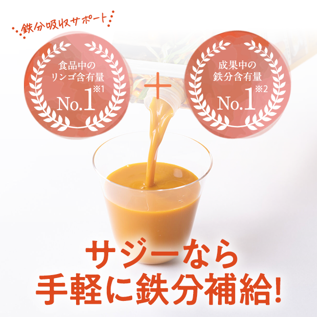 ※1生果実中No.1の鉄含有量:食品成分データベース(文部科学省)で、2008〜2022年の分析結果の平均値と比較 成分分析依頼先:一般財団法人 食品分析開発センター SUNATEC※1 栄養素の含有量は収穫年の天候等により変動がございます。※2 サジー原料に関する論文調査