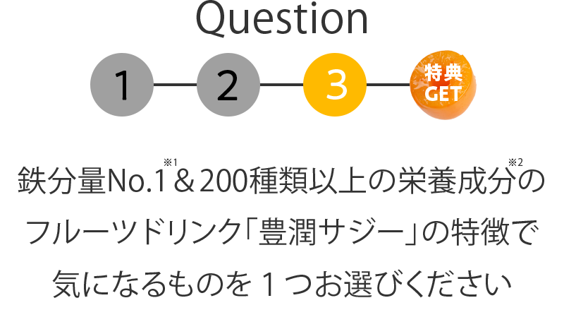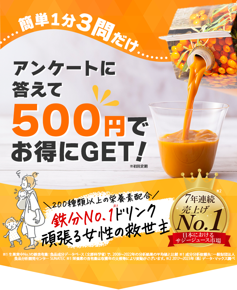 ※1 生果実中No.1の鉄含有量:食品成分データベース(文部科学省)で、2008〜2022年の分析結果の平均値と比較 ※1 成分分析依頼先:一般財団法人 食品分析開発センター SUNATEC ※1 栄養素の含有量は収穫年の天候等により変動がございます。 ※2サジーに関する論文調査より※3 「豊潤サジー」の商品情報を理解し、実際に使用した医師56名に対して、『信頼できる』と思うかアンケートを取得したところ、96.4%の医師が信頼できる(とてもそう思う、そう思う、ややそう思うの合計数値)と回答しております。(2022年4月~5月:Dr’s Review事務局調べ)※3 医師個人の印象であり効果効能等を保証するものではありません